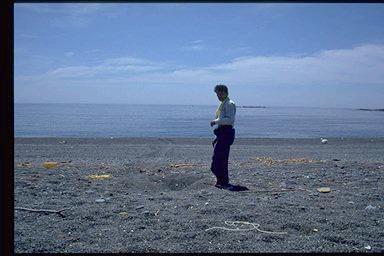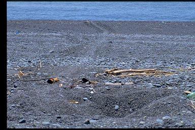 ![]() 瓶のついでに亀のことも。芦浜はアカウミガメが産卵に訪れます。これはカメが這いずり廻った痕、上陸痕と産卵巣。 |
