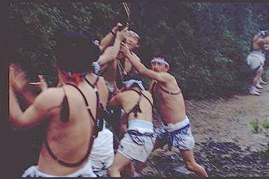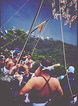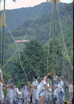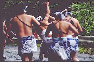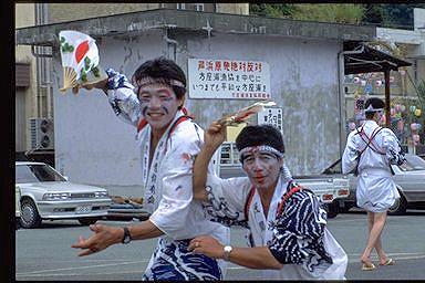 南島町方座浦では浅間祭りが行われます。山の中腹には「芦浜原発実力阻止」の看板が見えます。